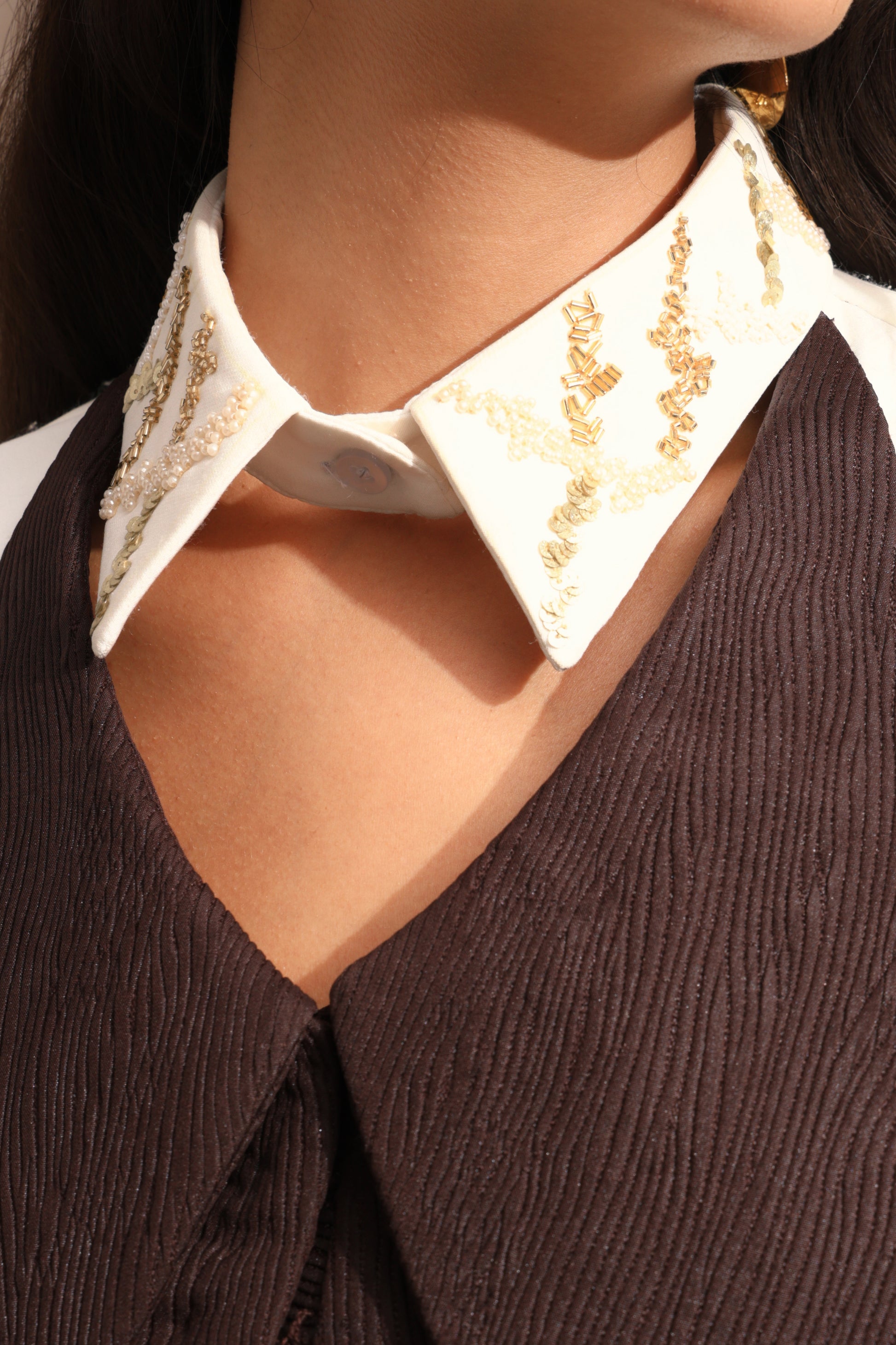 The Brunella Set is a sophisticated two-piece outfit in brown, white, and gold. The long-sleeved top features a distinctive double collar, with one collar beautifully detailed in gold and white handwork. The straight trousers are designed with sheer gold organza side panels, adding a graceful and modern touch. This set combines timeless elements with delicate accents, making it an ideal choice for those who want to stand out with subtle elegance.