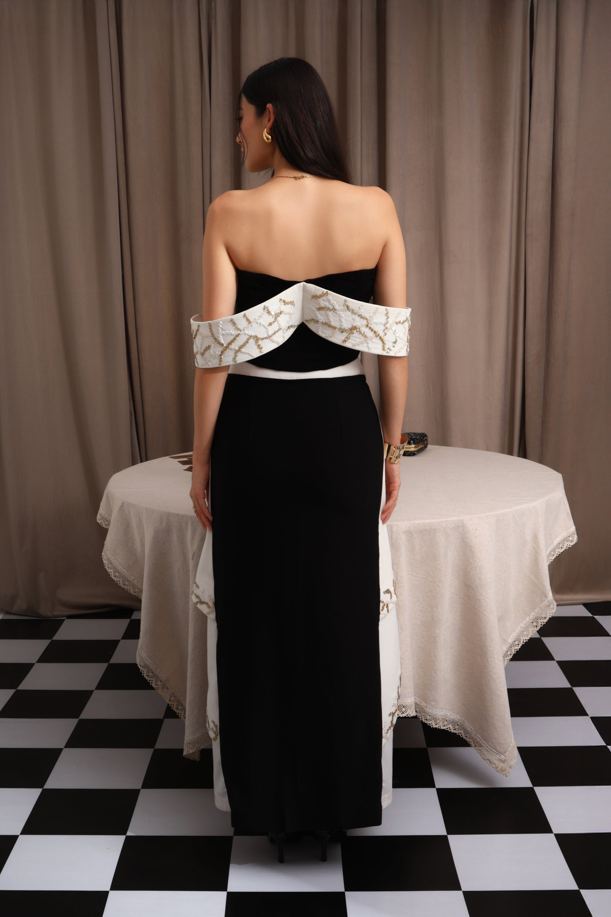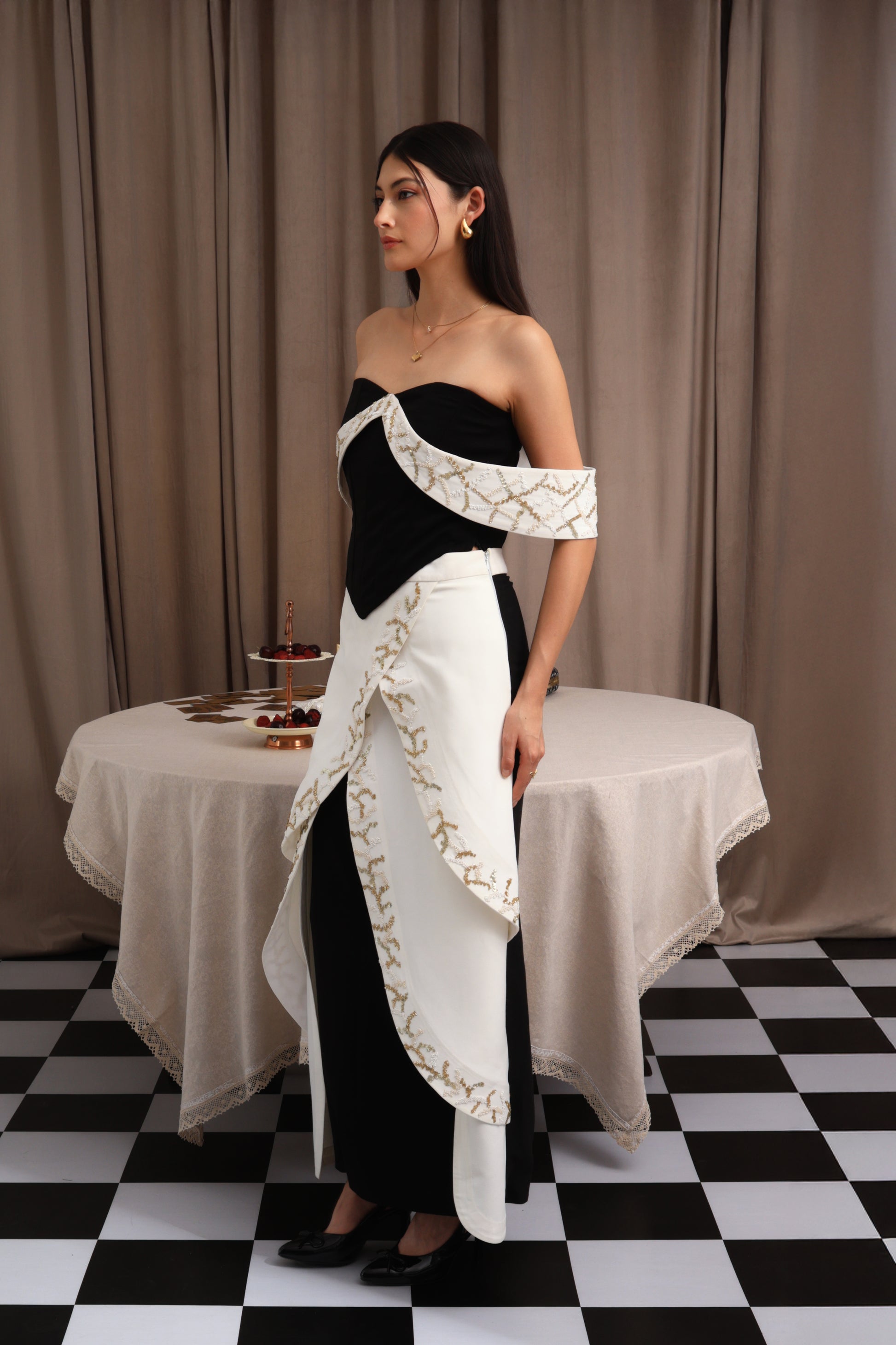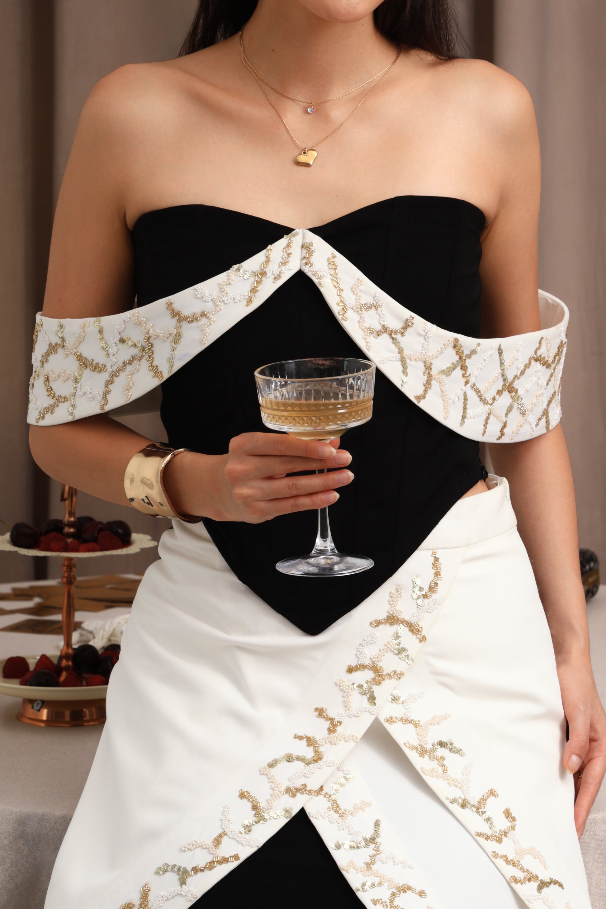 The Celeste Corset Top stands out with its bold black-and-white design, richly detailed with intricate gold hand embroidery. Its sleek tube silhouette is beautifully complemented by dramatic white cascading sleeves, adorned with fine white and gold embroidery, offering an elegant and refined look that makes a memorable statement at any special event.
