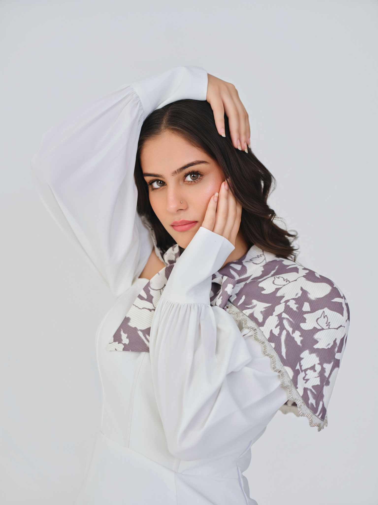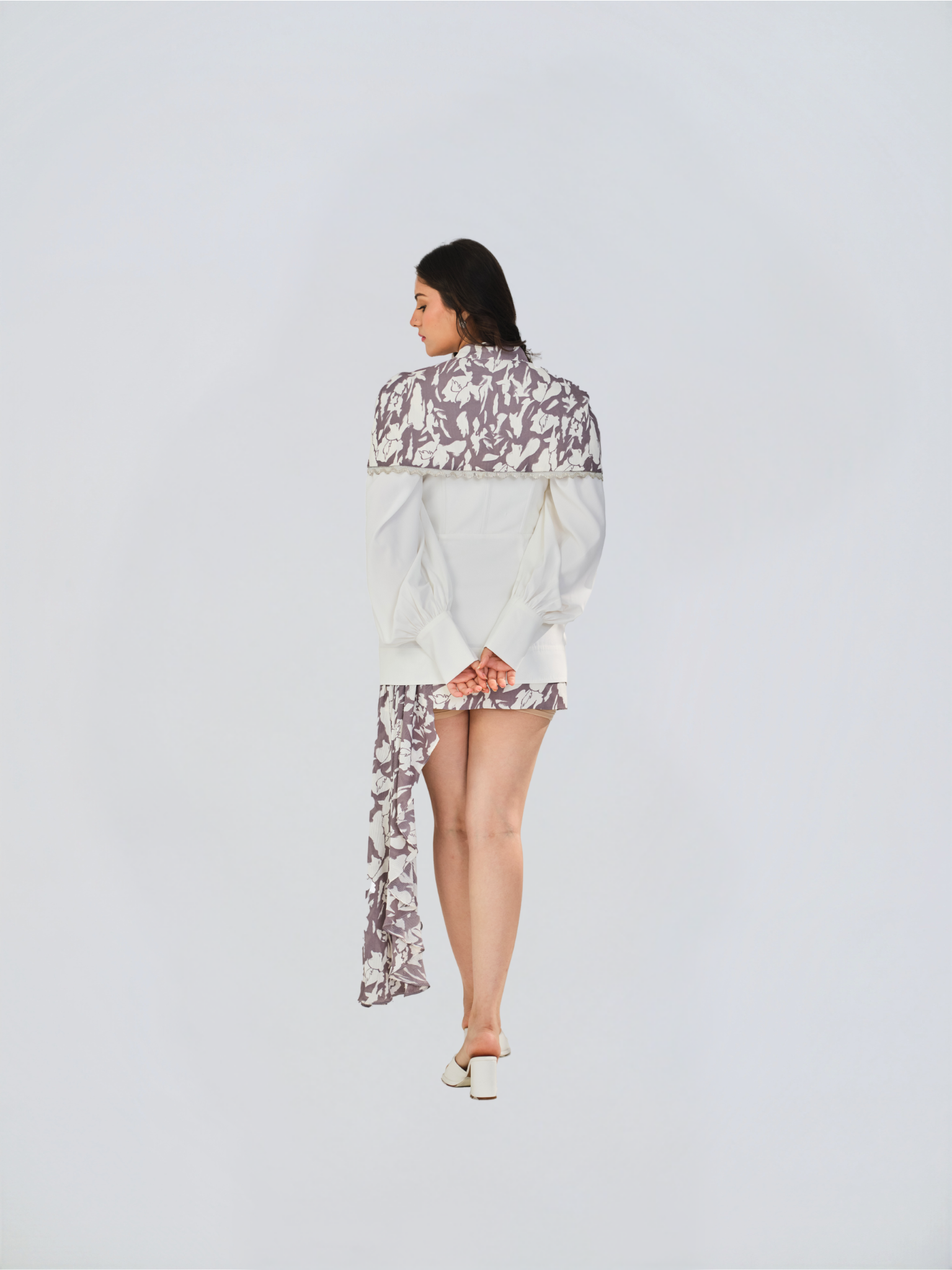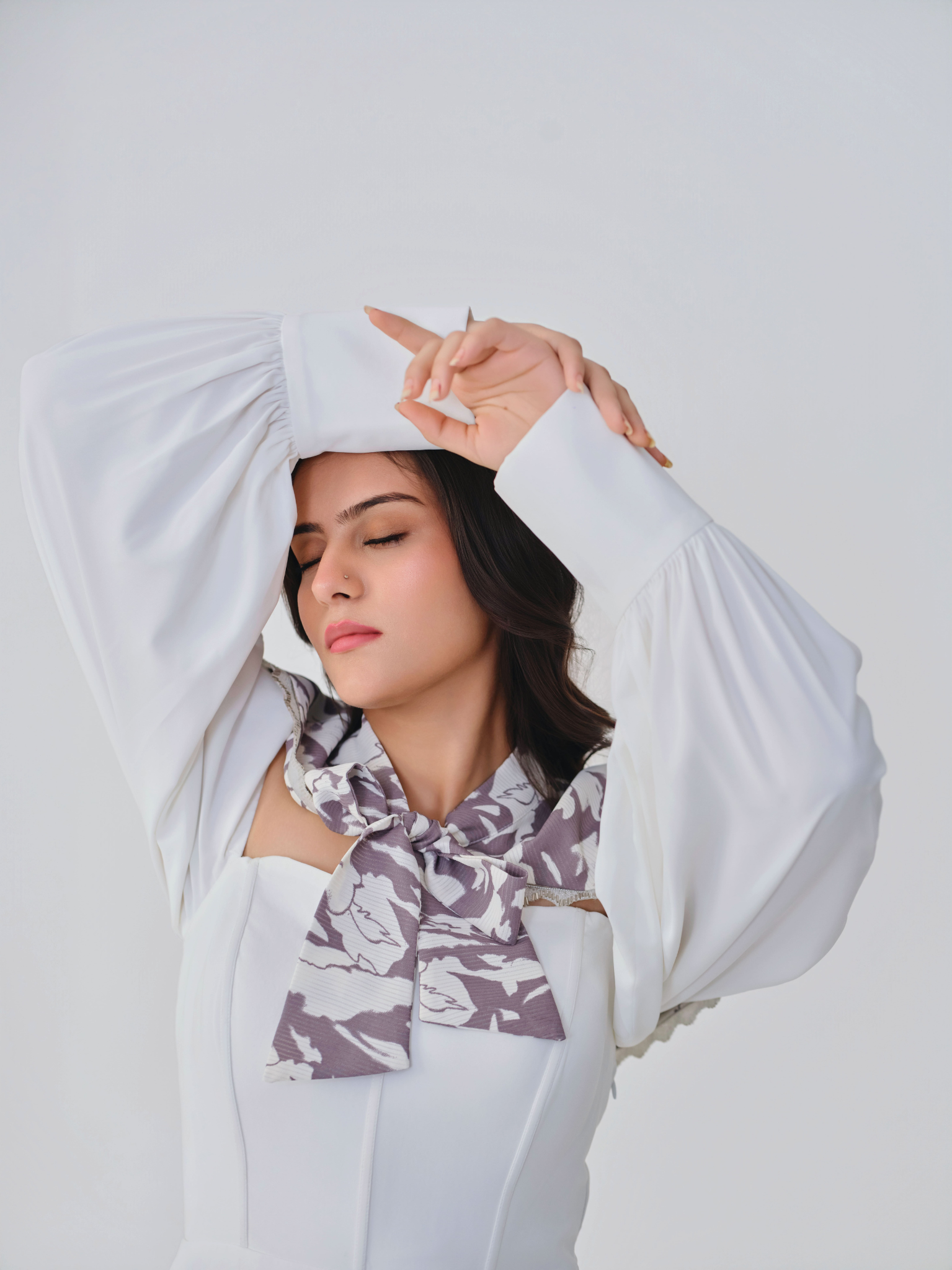 Sculpted silhouette with draped bishop sleeves and exaggerated cuffs. Features a soft cinched waistline and a statement botanical drape set—a scarf-like overlay with asymmetric frill detailing at the hem. A perfect balance of structure and softness, embodying modern romanticism with a rebellious twist.