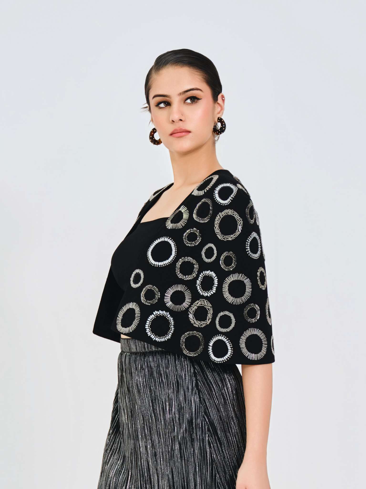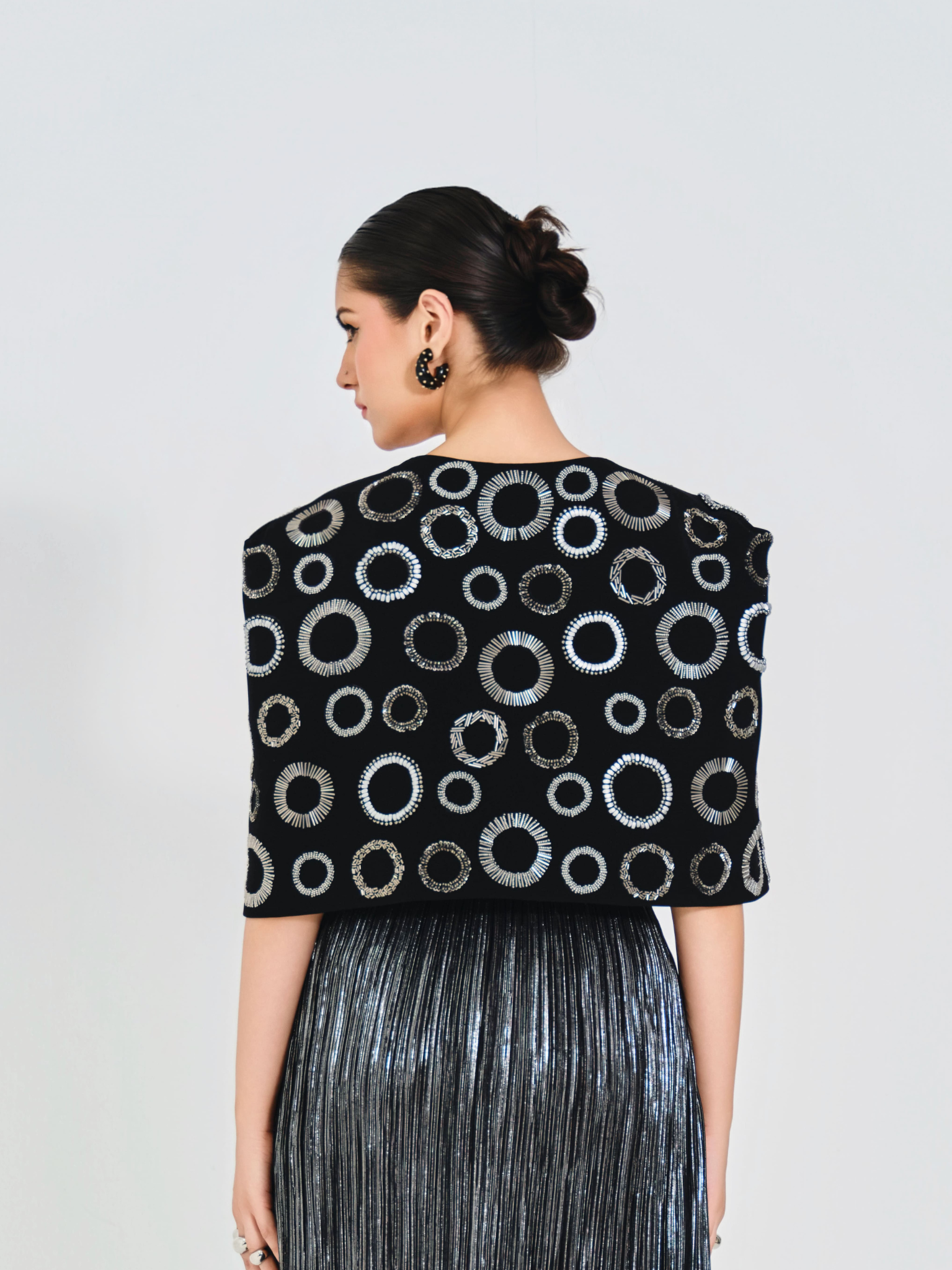 Silver midi skirt in a textured wrinkled fabric paired with a sleek black bustier. Finished with a black structured cape adorned with silver-grey circular handwork across the fabric for an elegant, statement finish.