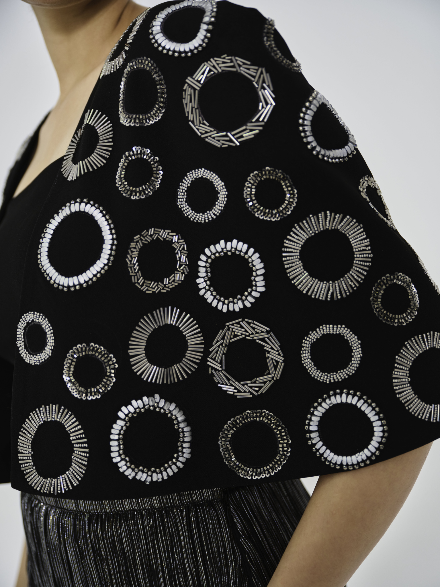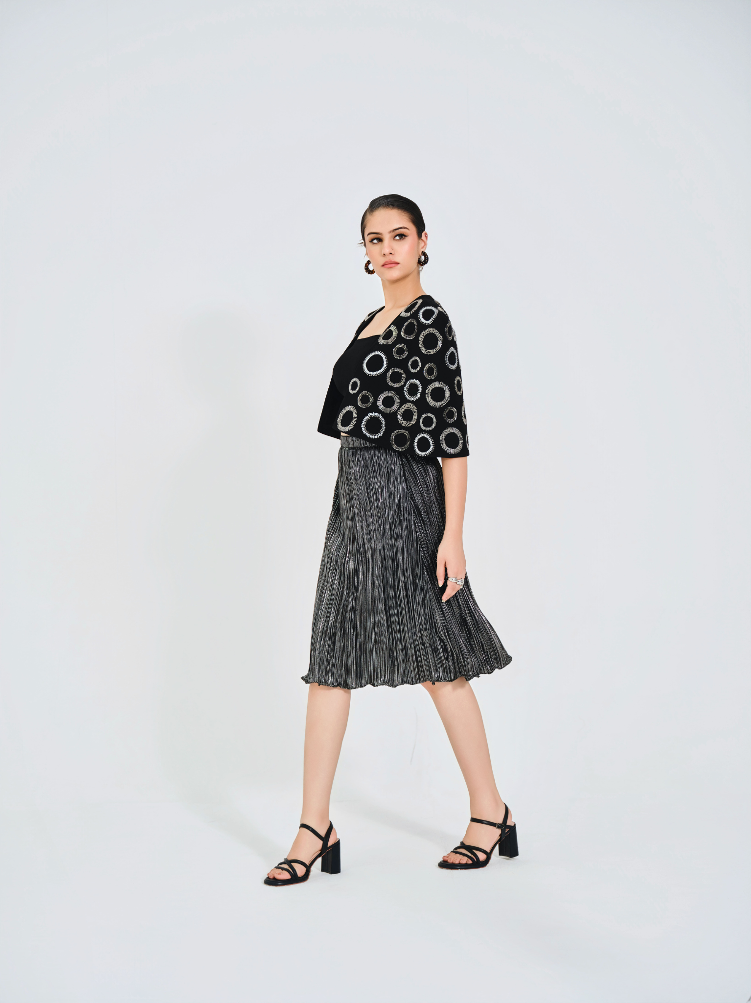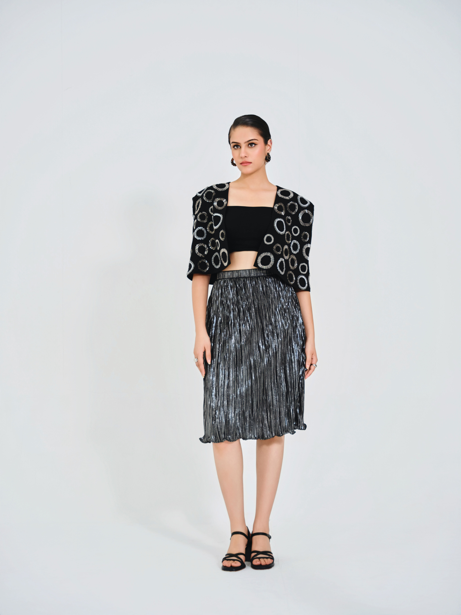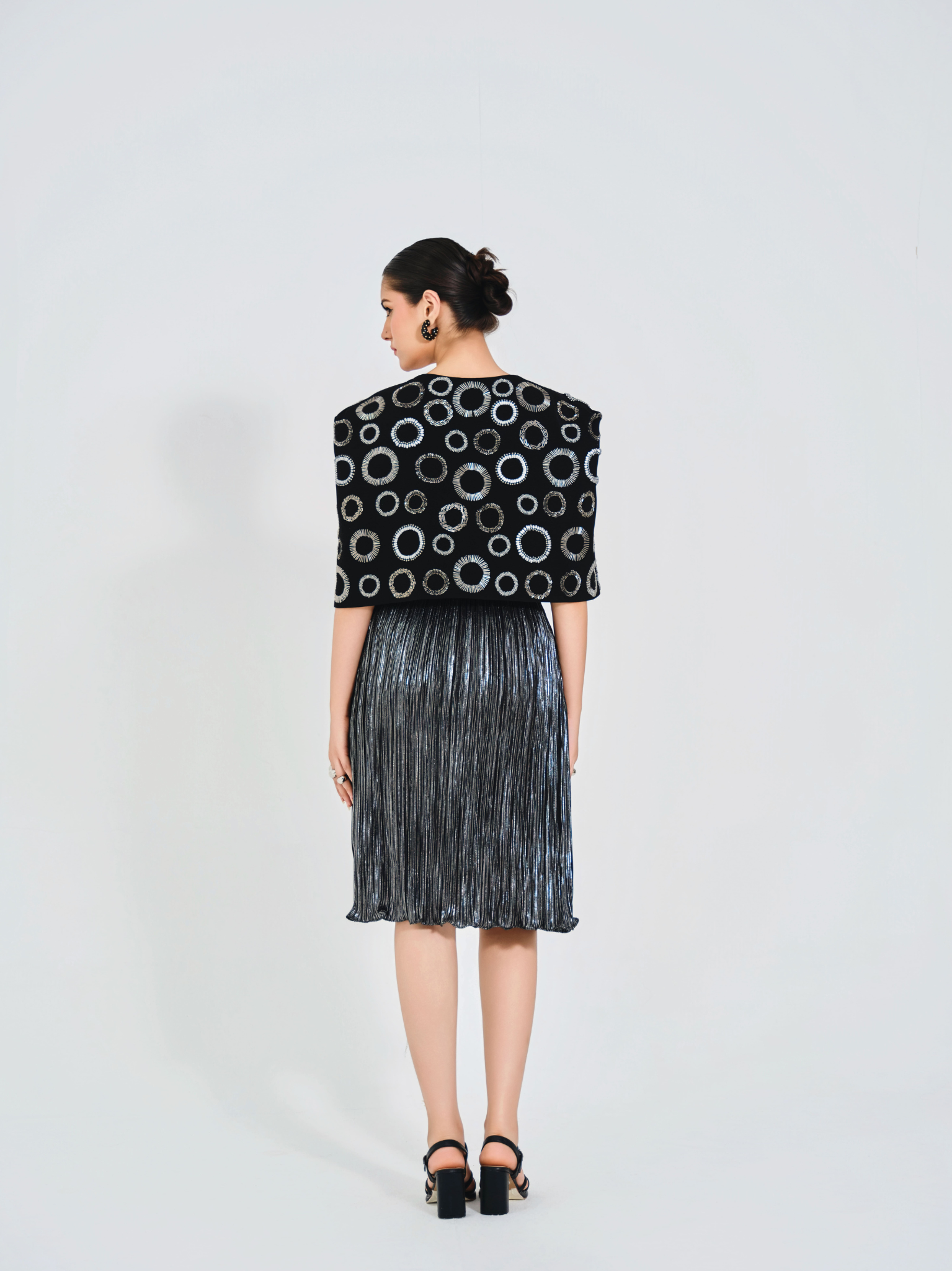 Silver midi skirt in a textured wrinkled fabric paired with a sleek black bustier. Finished with a black structured cape adorned with silver-grey circular handwork across the fabric for an elegant, statement finish.