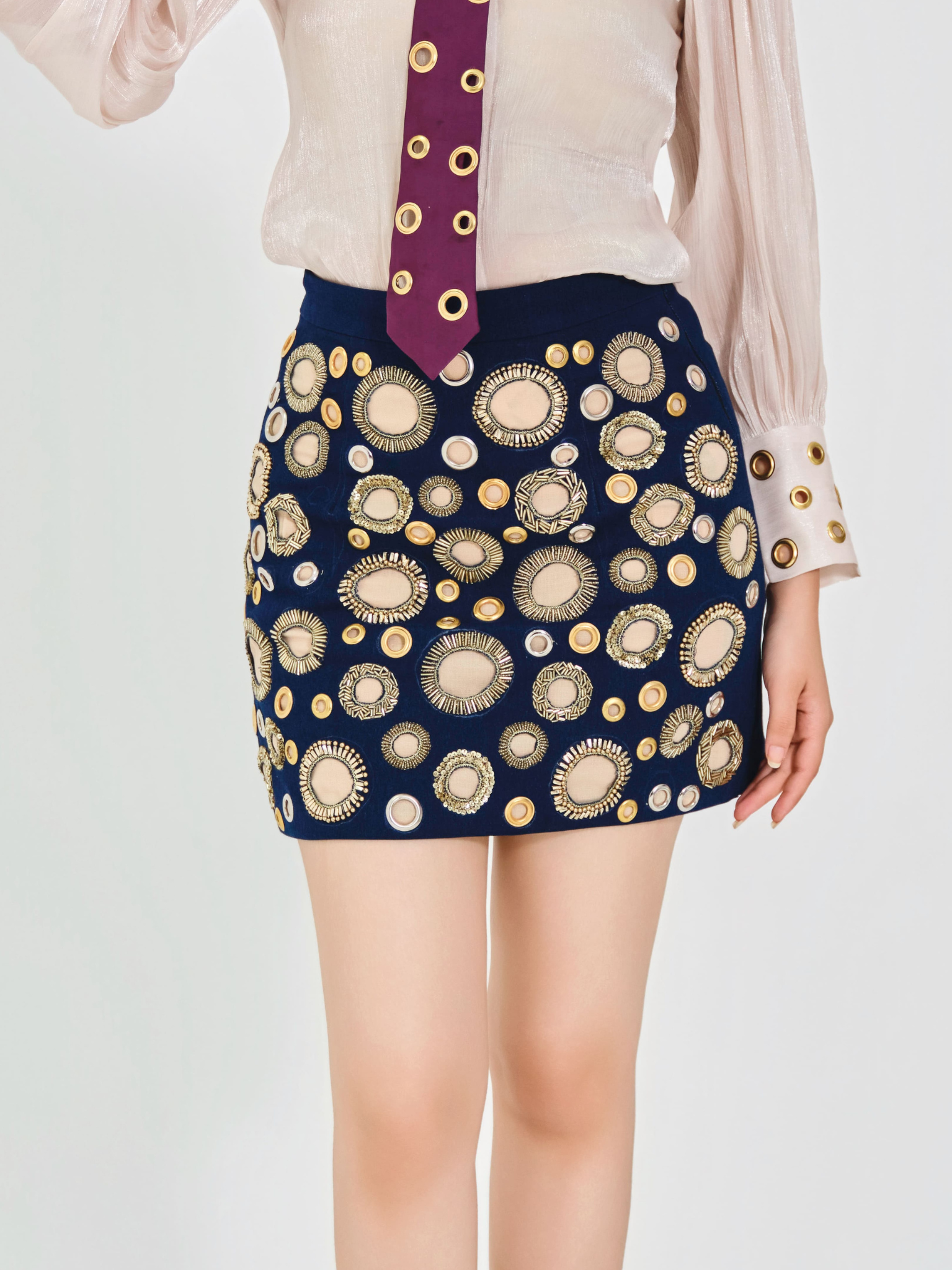 Riveted denim skirt with circular handwork, metallic eyelets, and a beige contrast lining peeking through. Paired with a see-through shimmer shirt and a detachable purple tie adorned with matching eyelets — a bold, editorial statement.