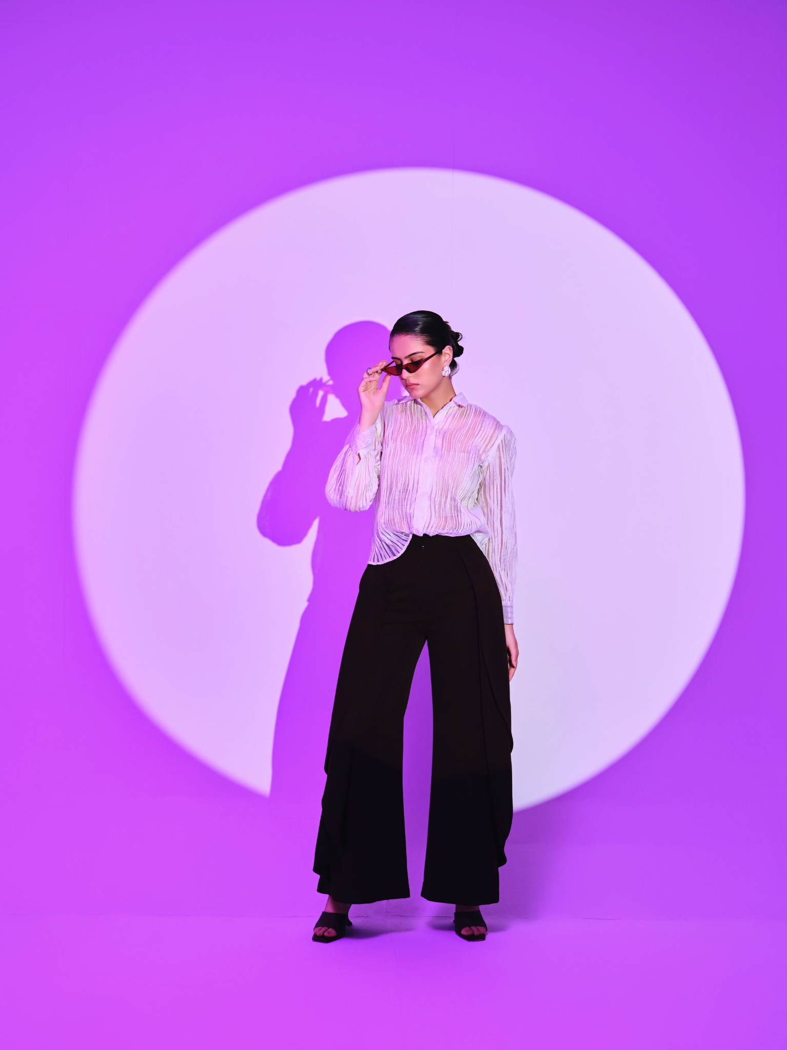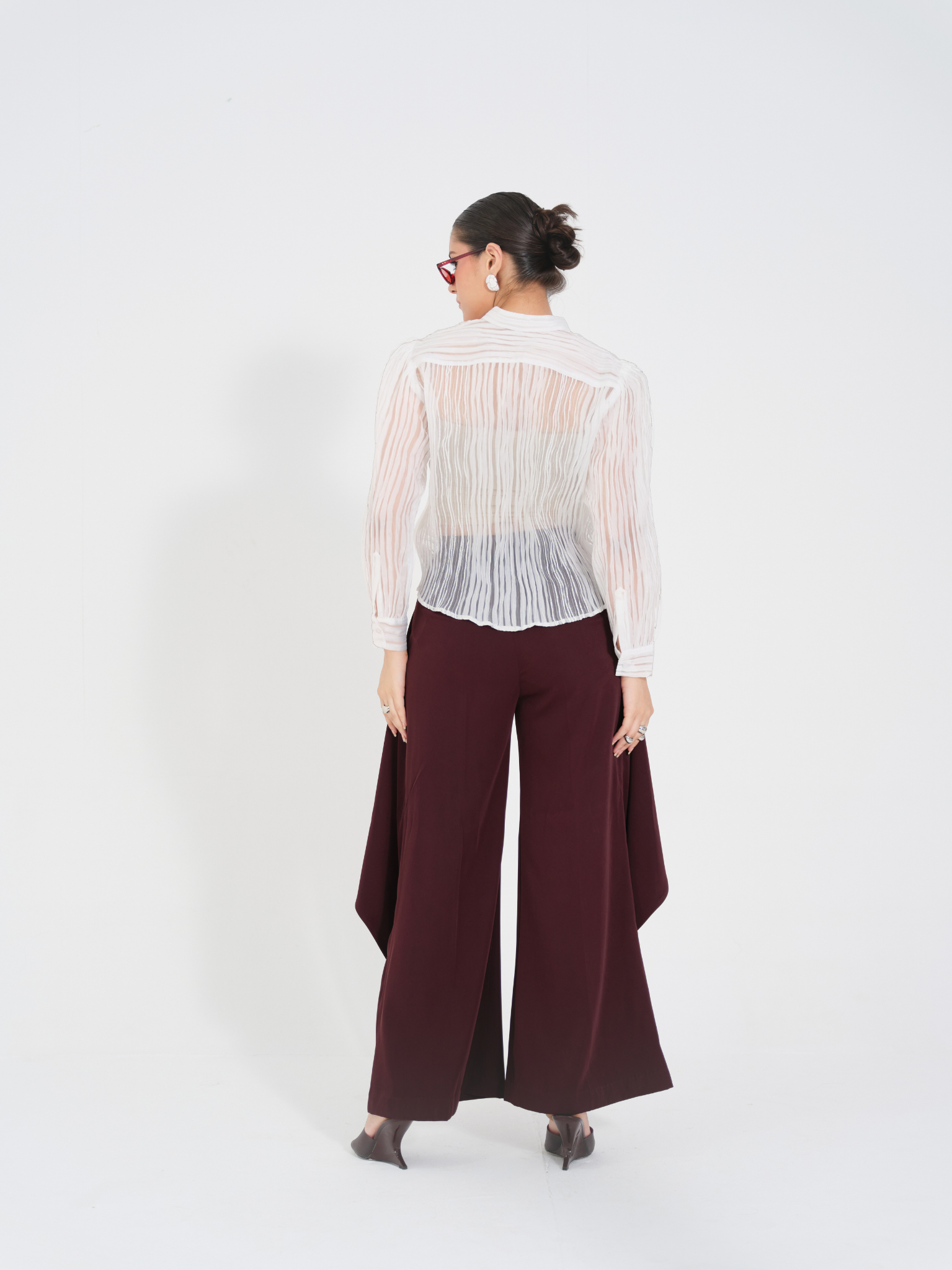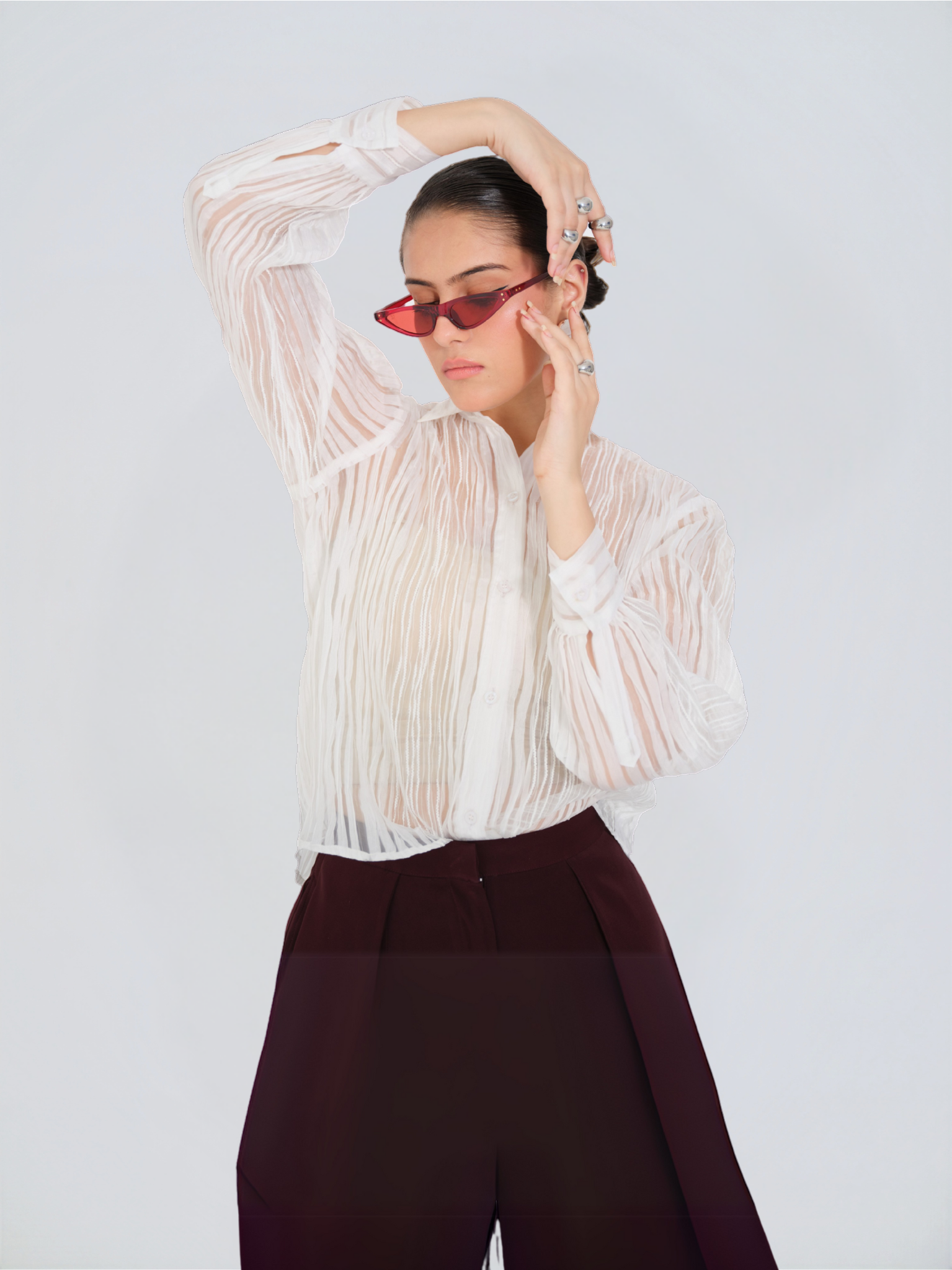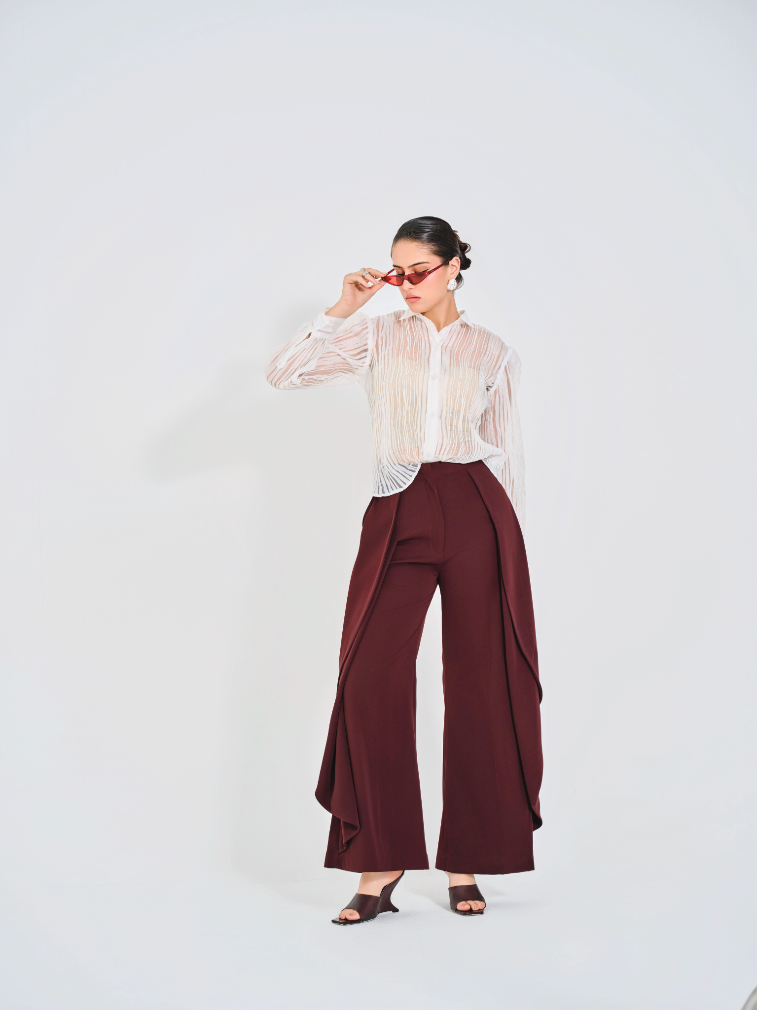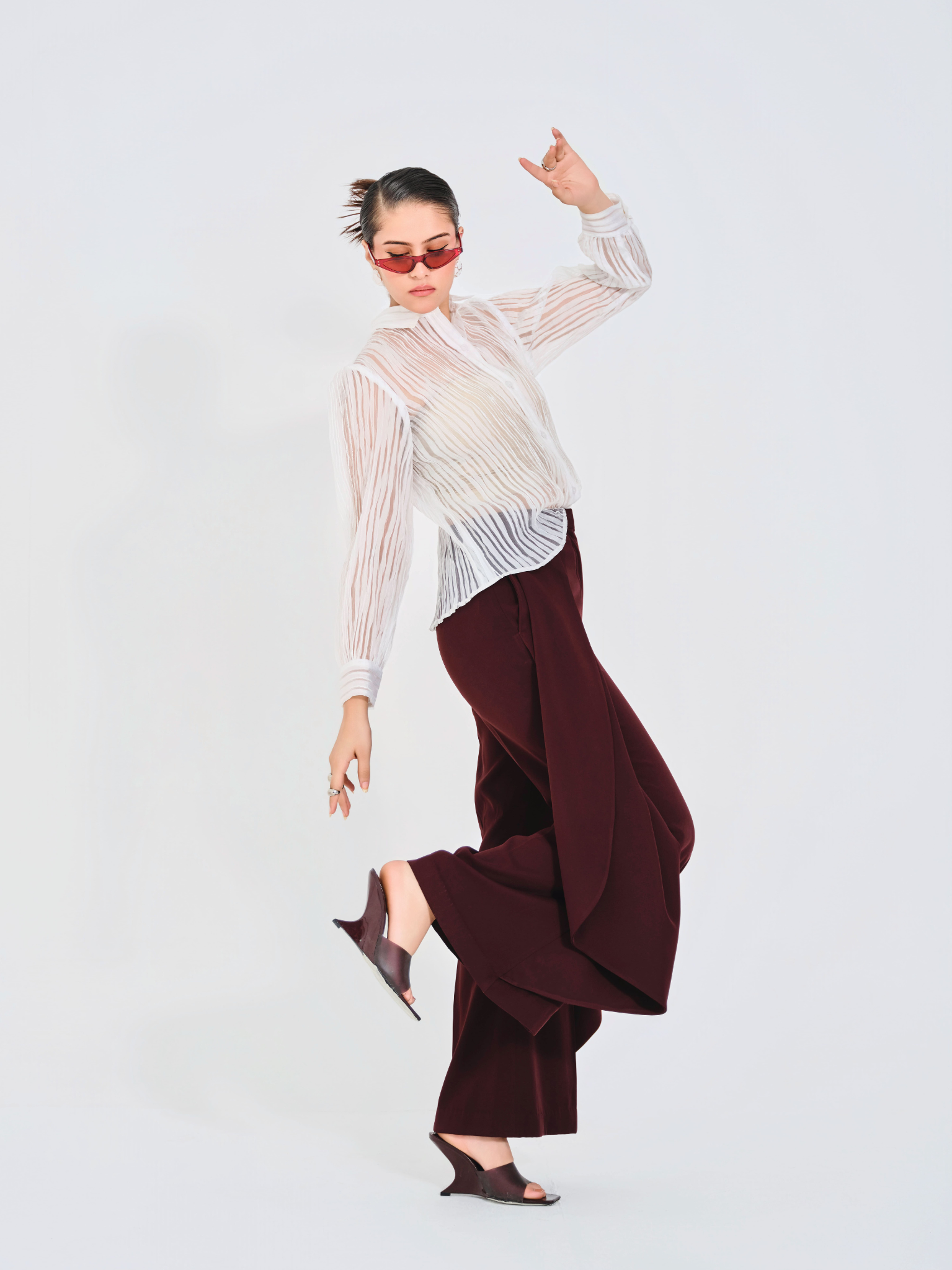 Brown flared pants with bold ruffle detailing on both legs, paired with a see-through textured formal shirt that balances edge with elegance.
