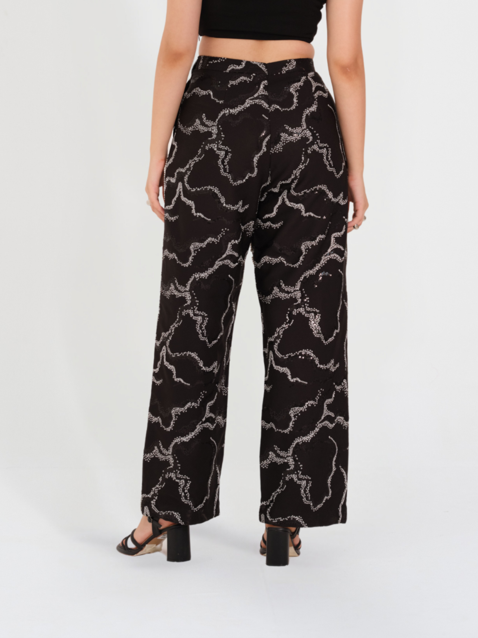 Crop bustier with pearl-scattered detailing and leather wire straps, paired with black and white sequin pants featuring pearl highlights at the front.