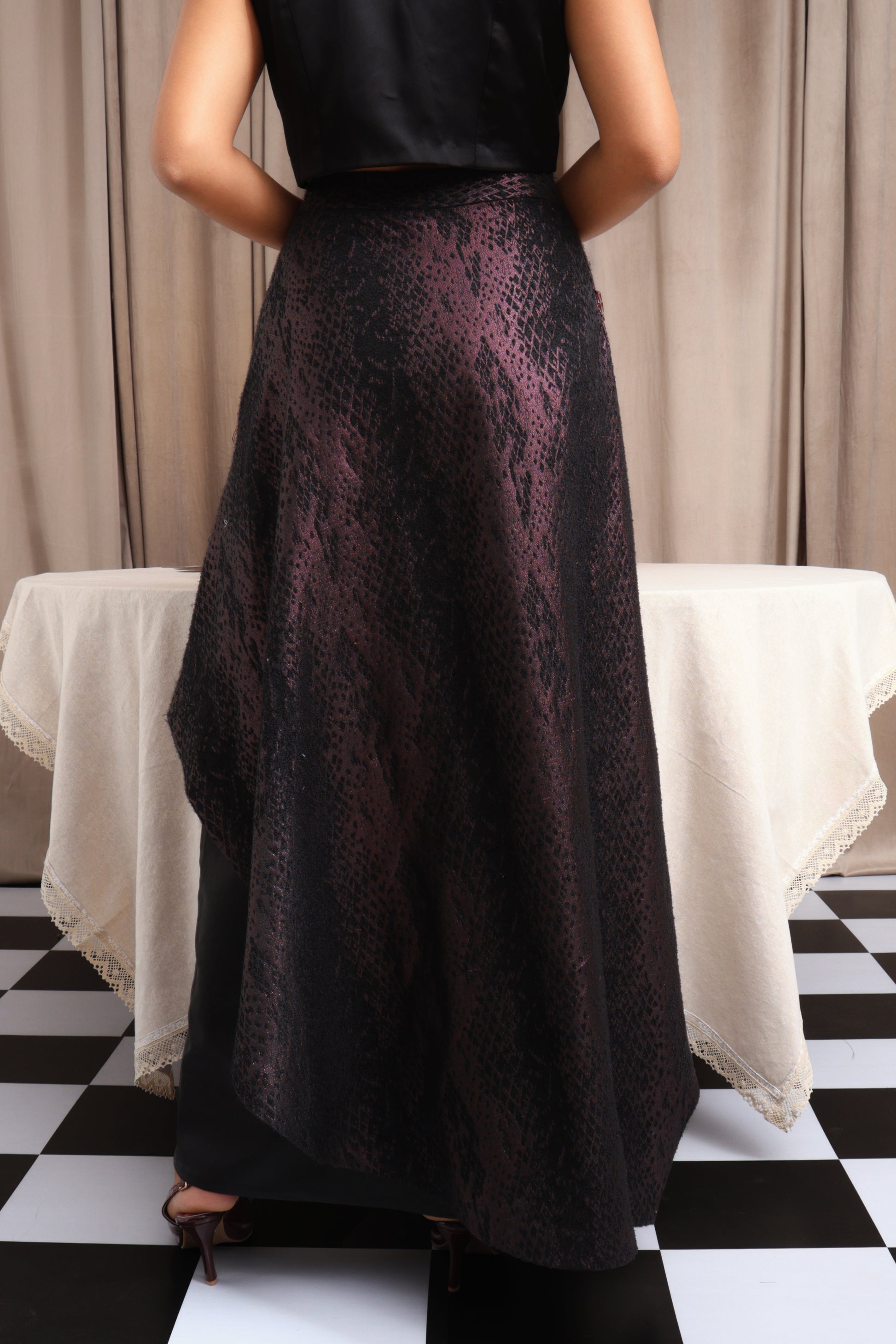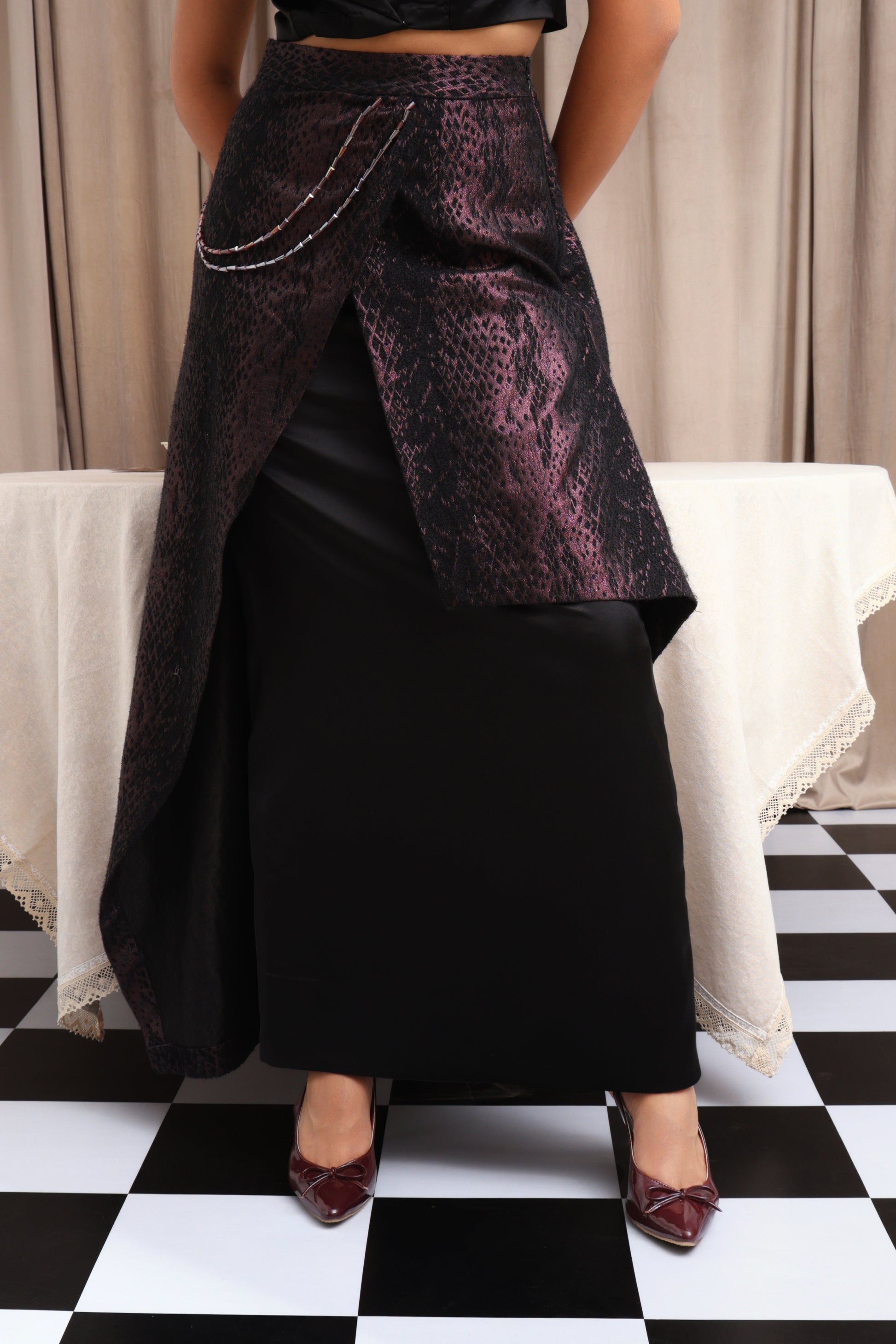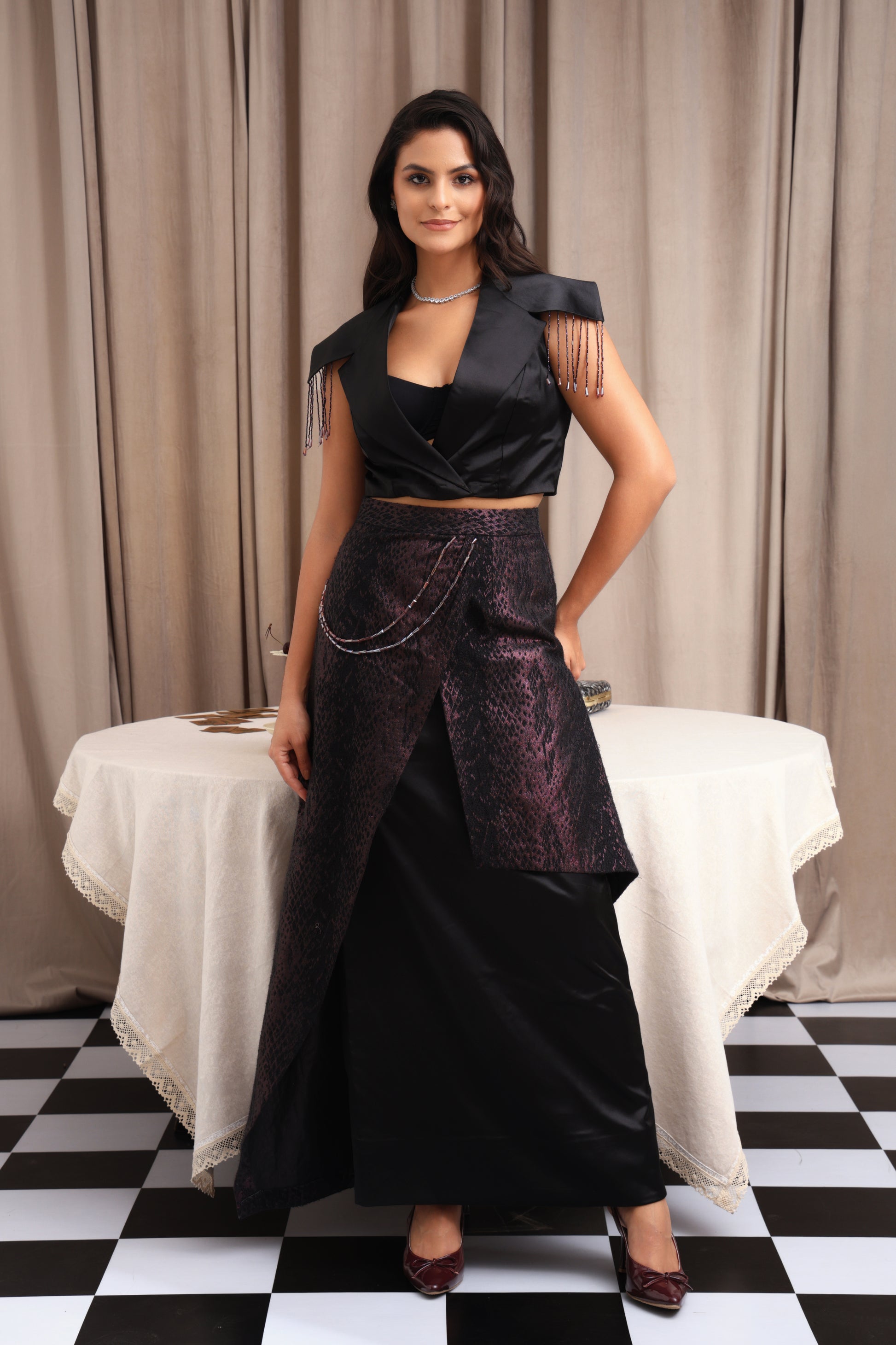 This Obsidian Set combines bold style and elegant details for a standout look. The cropped blazer in black and purple satin features a deep V-neck, an exaggerated collar, and delicate hanging embellishments that add subtle movement. Its matching maxi skirt drapes asymmetrically with purple panels and hanging accents at the waist, creating a dynamic silhouette that turns heads effortlessly. Perfect for making a confident statement at any event, this set blends striking design with refined craftsmanship.