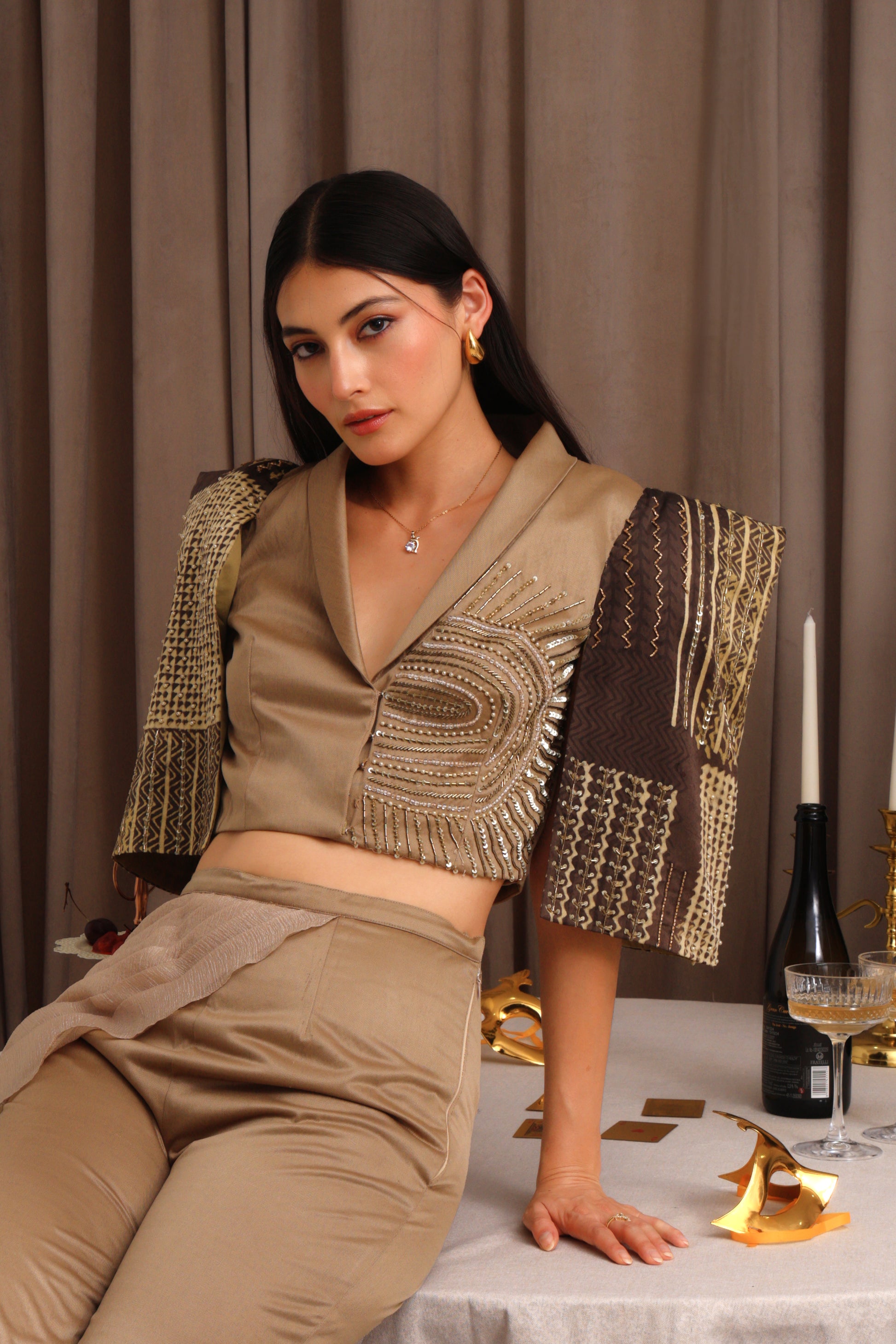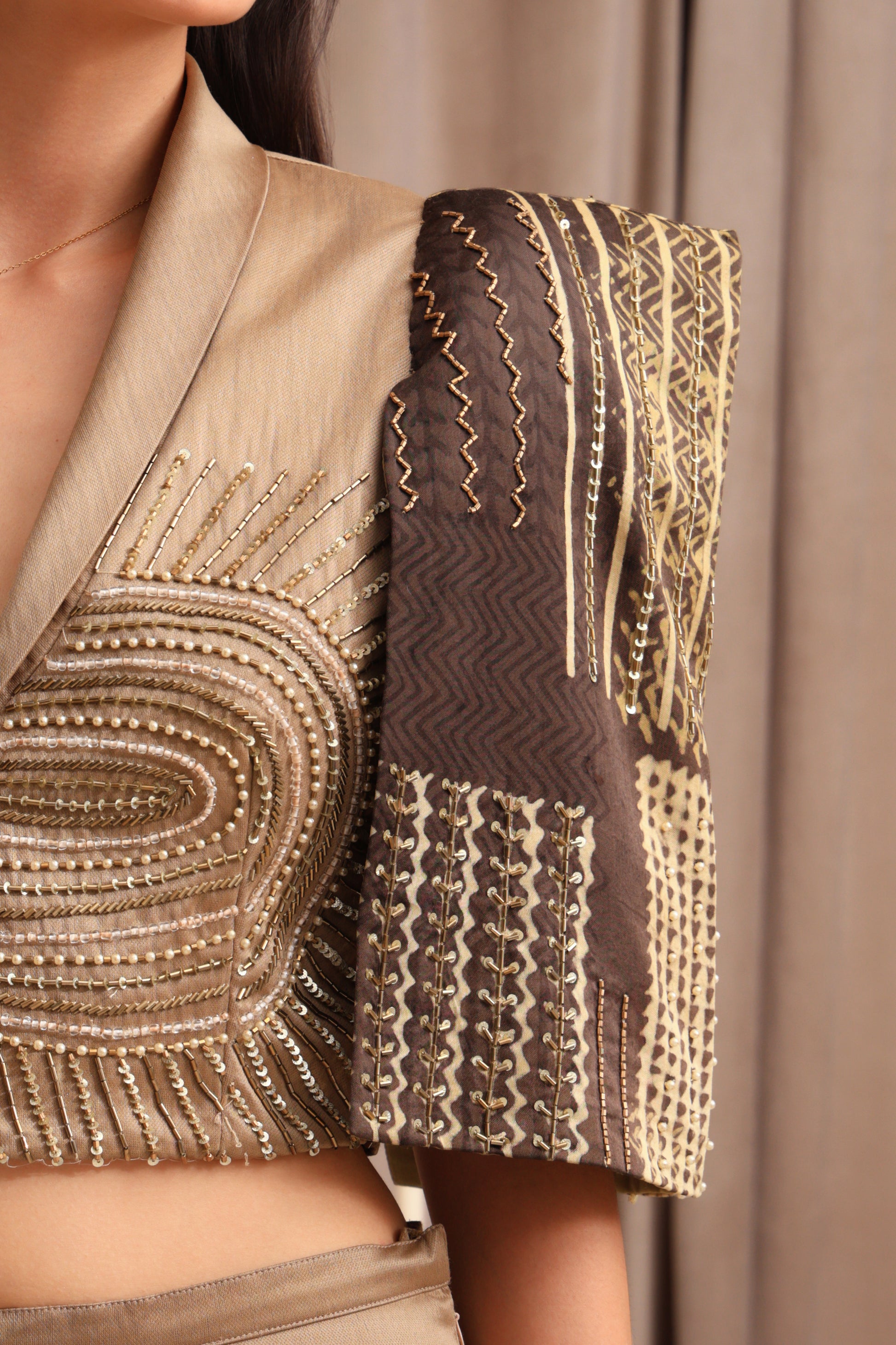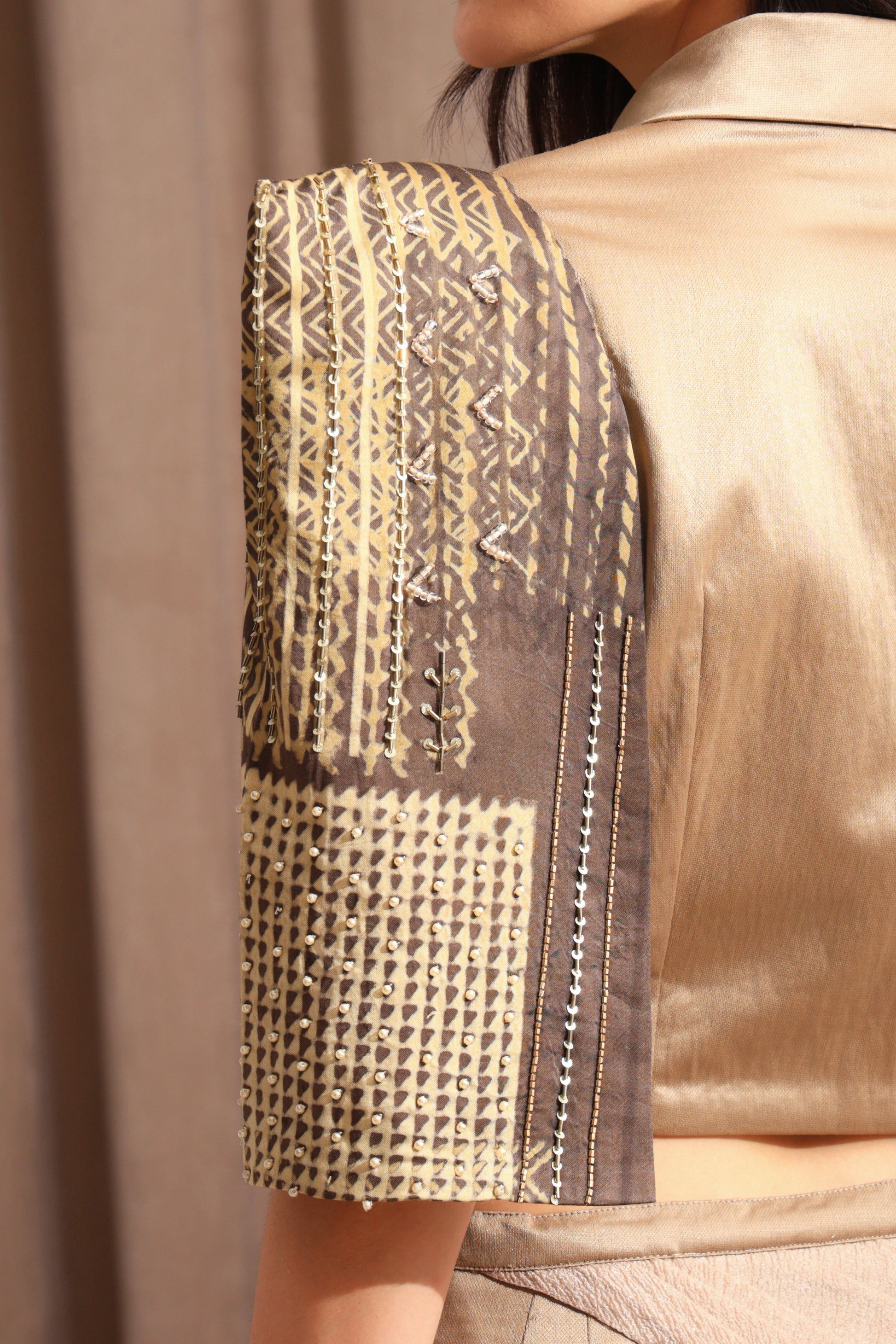 The Sahara Blazzer is a chic cropped jacket in rich rust gold with brown accents. It features structured shoulder pads, striking printed sleeves, and a hand-embellished left panel that gives it a distinctive and elegant touch. This blazer is designed to elevate your look with unique detailing and a bold silhouette, perfect for making a stylish statement on any occasion.