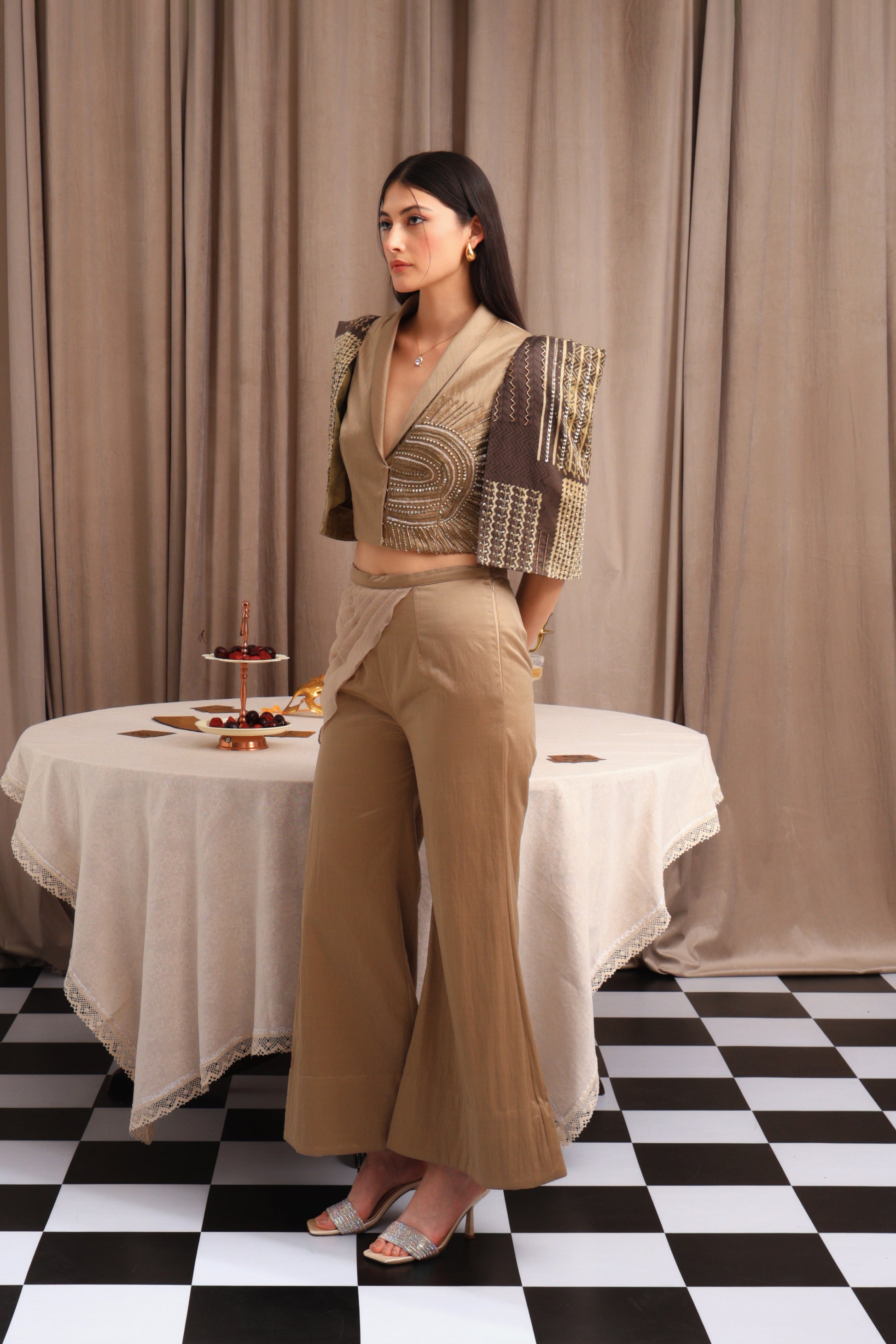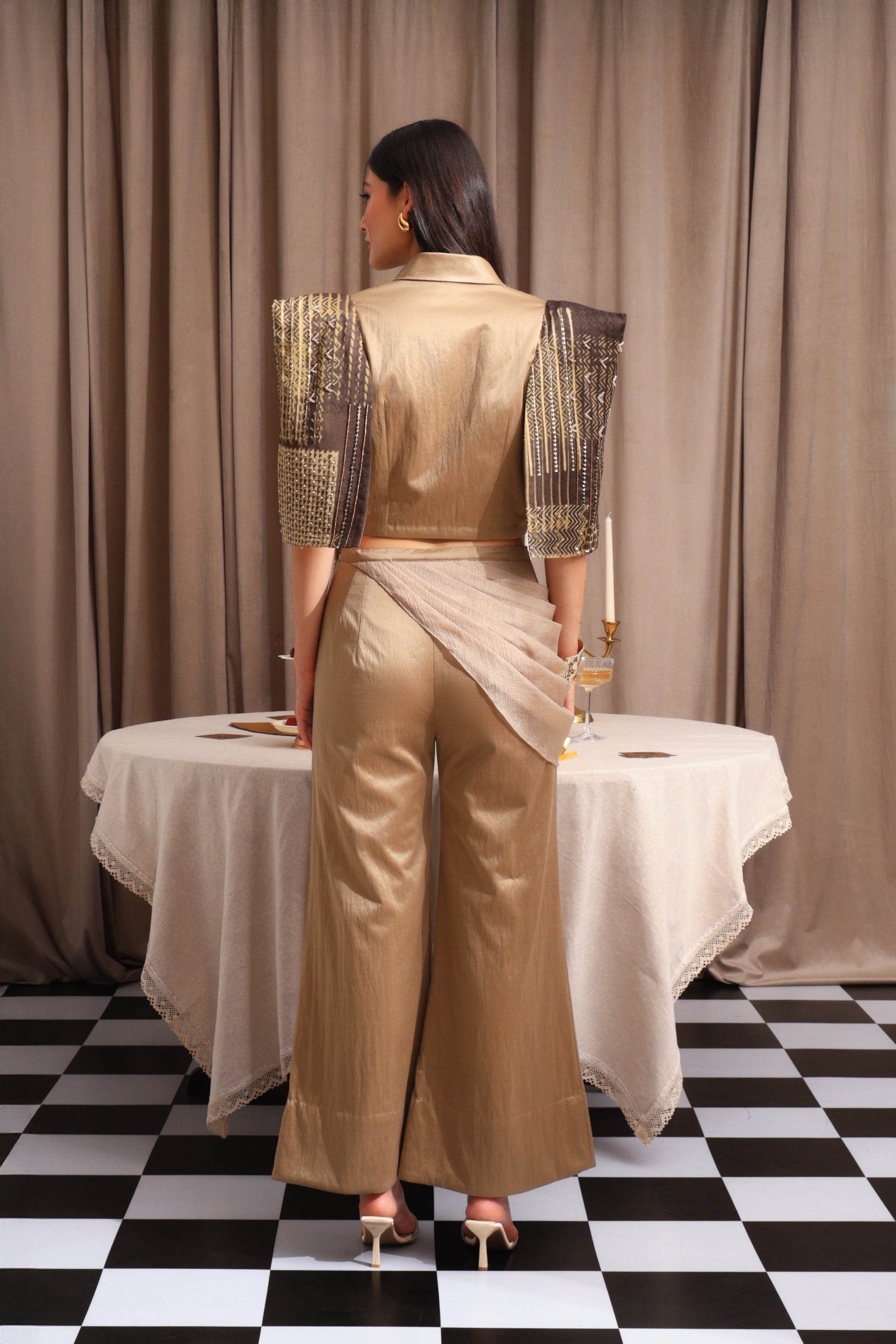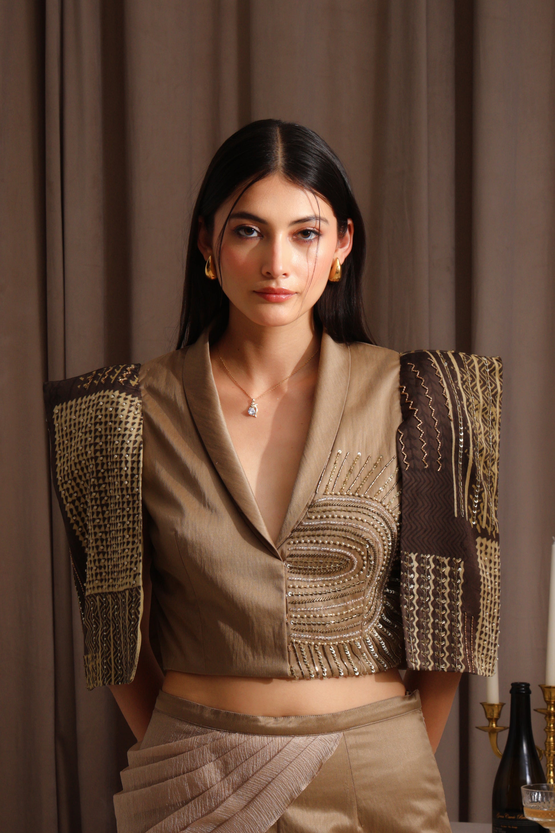 The Sahara Blazzer is a chic cropped jacket in rich rust gold with brown accents. It features structured shoulder pads, striking printed sleeves, and a hand-embellished left panel that gives it a distinctive and elegant touch. This blazer is designed to elevate your look with unique detailing and a bold silhouette, perfect for making a stylish statement on any occasion.